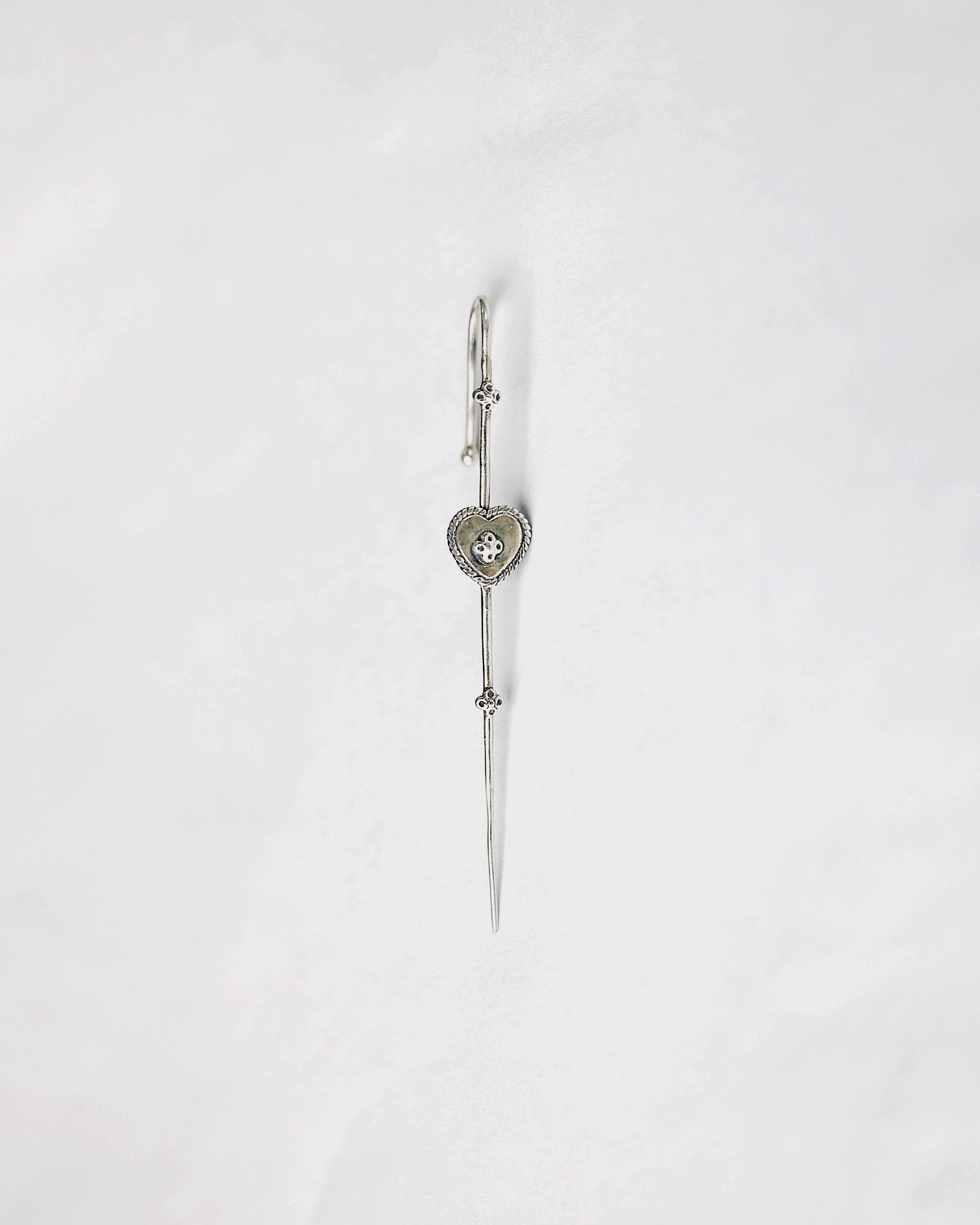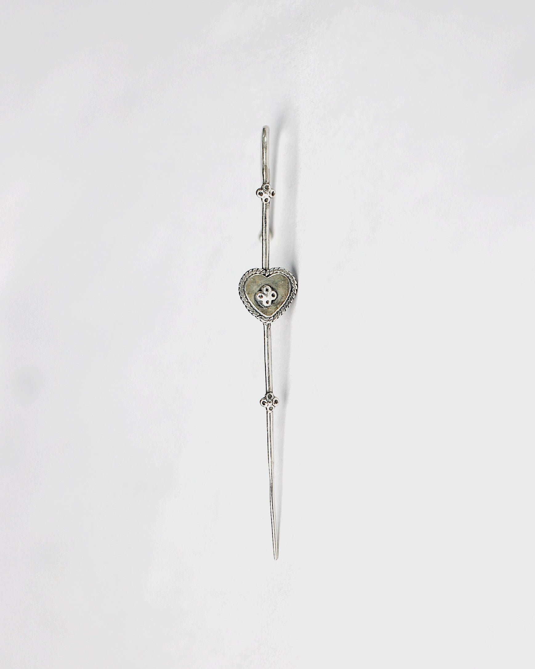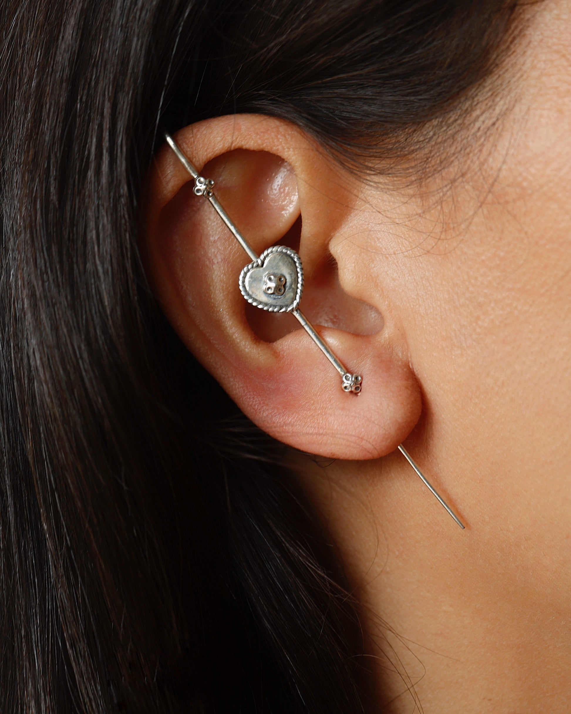 A love note in silver. This handcrafted 92.5 silver ear cuff features a central oxidized heart flanked by vintage bead accents—threaded cleanly across the ear for a bold, heartfelt statement.