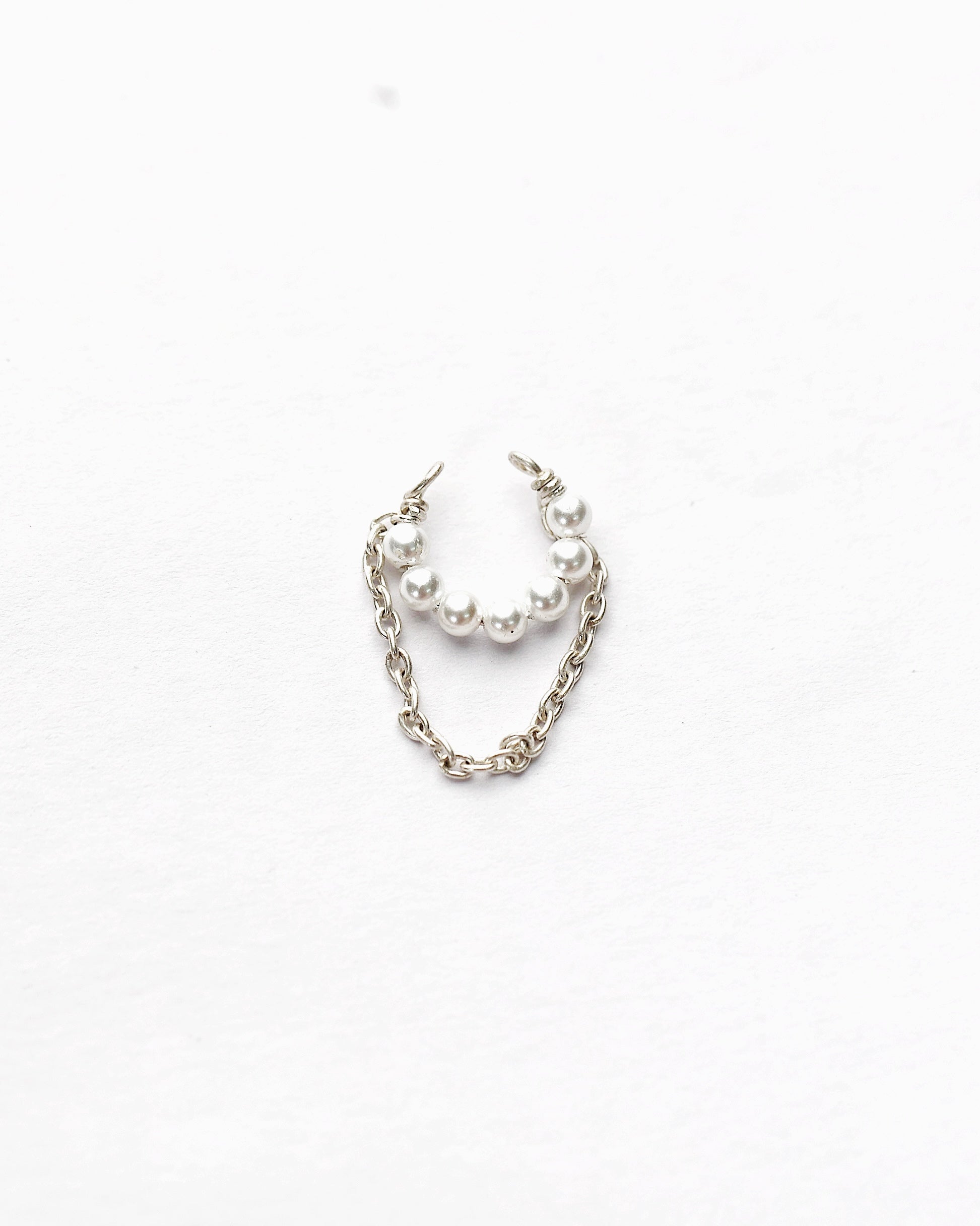 Minimal meets bold. This handcrafted silver cuff features a row of delicate pearls linked with a dainty chain, wrapping your ear in effortless elegance—no piercing required.