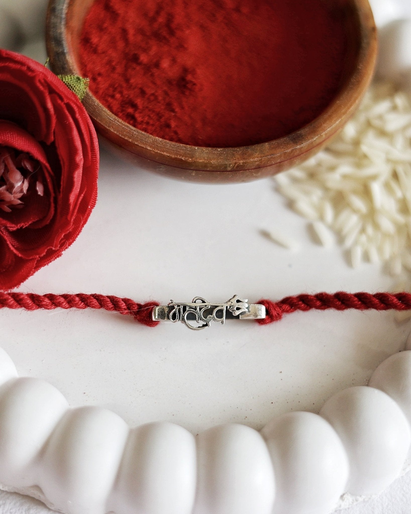 Meticulously designed for both meaning and versatility, this exquisite silver charm is securely strung on a traditional red thread, symbolizing the sacred bond of Raksha Bandhan. After the celebrations, the elegant silver element effortlessly transforms into a stylish watch charm, allowing your brother to carry a blessing of strength and divine guardianship with him every day.