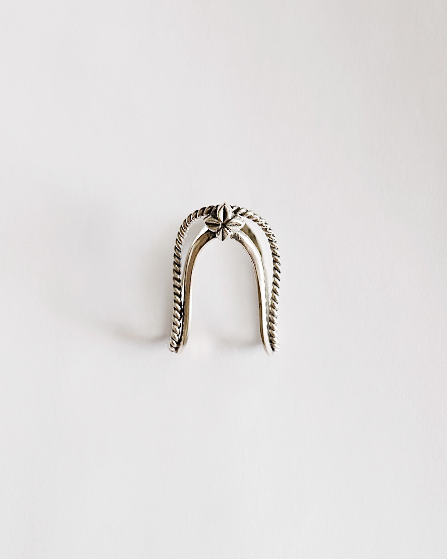 Minimal curves. Maximum charm. The Aara Ring flows like a silken river — gracefully framing your finger with twisted rope edges and crowned by a delicate four-petal floral motif. Handcrafted in 92.5 sterling silver, it’s a fusion of softness and strength, tradition and trend.