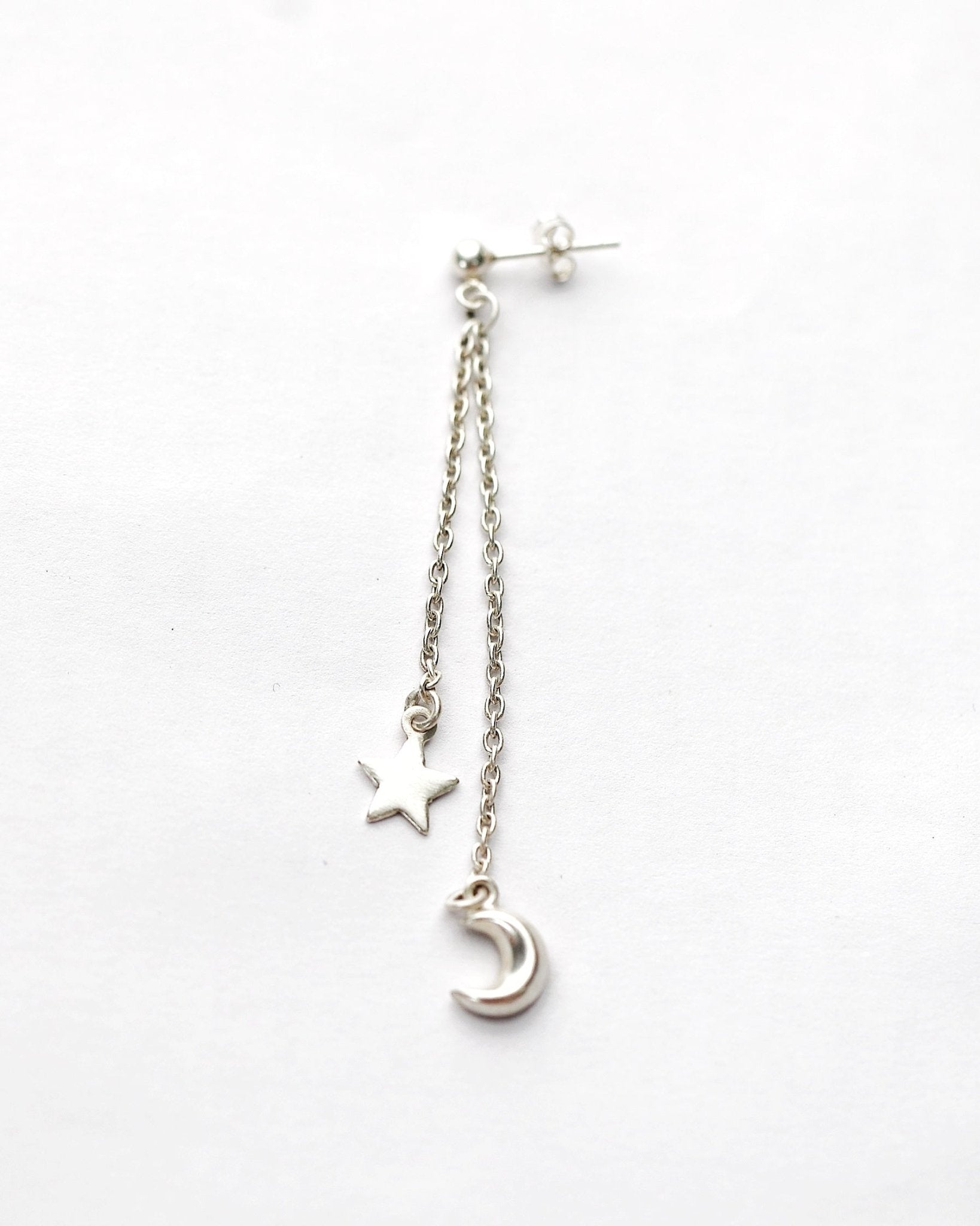Chase stars, wear moons. Handcrafted in 92.5 silver, this sleek drop earring features dual chains adorned with a gleaming star and crescent moon—bringing cosmic charm to everyday looks.