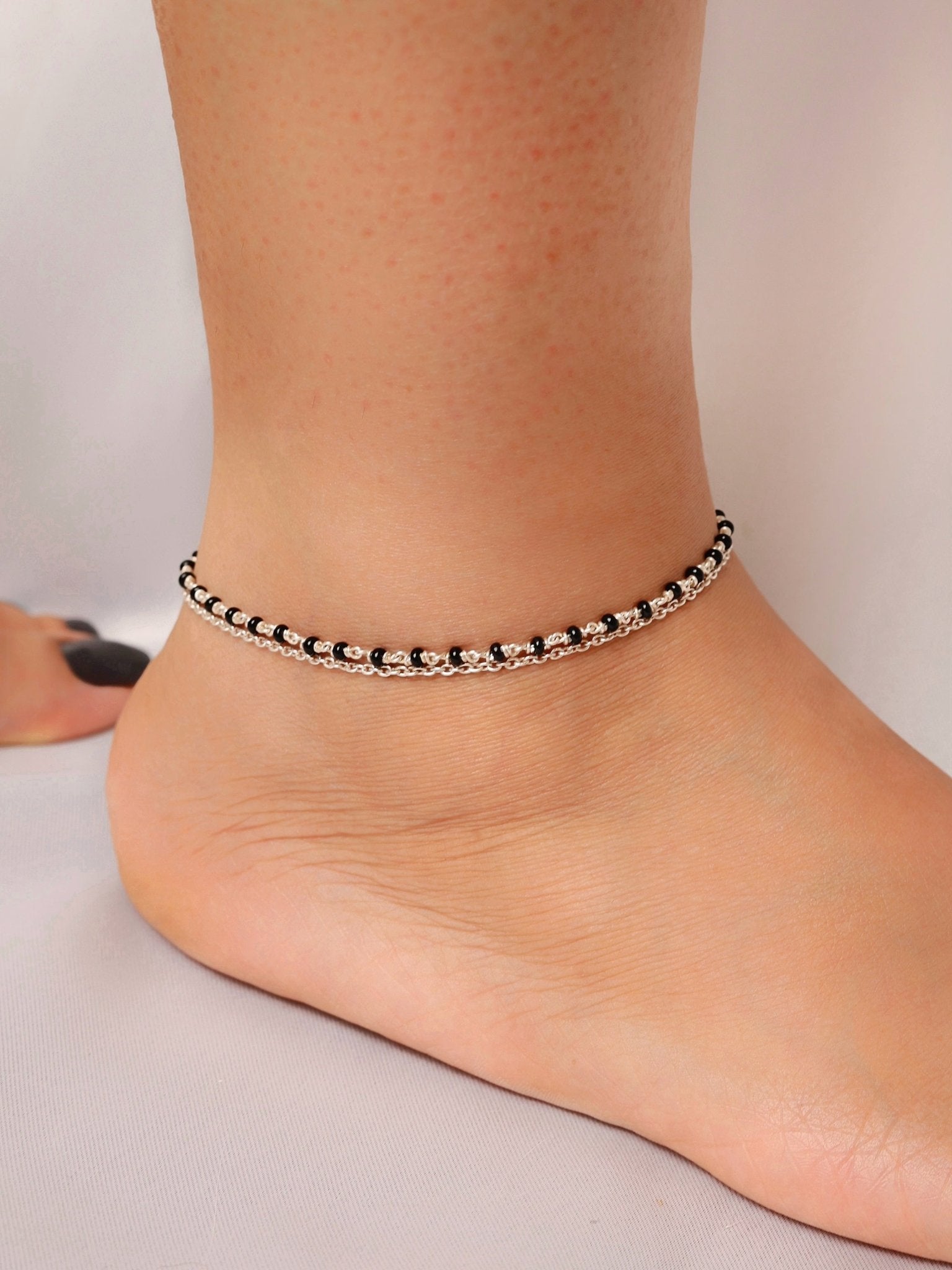 Step into your power with the Smith Jewels 'Urban Shield' Black Beads Nazarbattu Anklet. This striking piece is a testament to modern elegance fused with timeless protection, designed for the discerning individual. It features a sleek 92.5 Sterling Silver chain expertly interwoven with luminous black beads, creating a sophisticated pattern that captivates and protects.