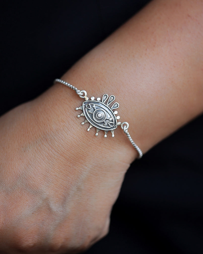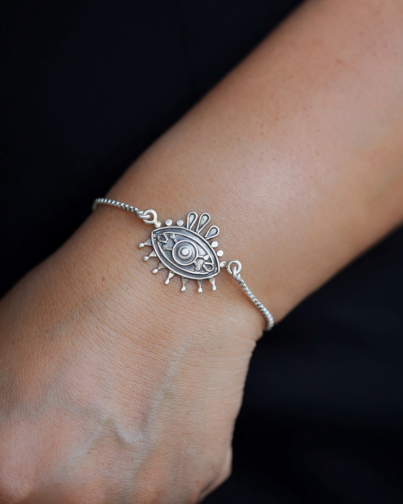 Handcrafted in 925 silver, this elegant evil eye bracelet blends timeless style with protective energy. A subtle statement piece designed to guard your aura and elevate your everyday look.
