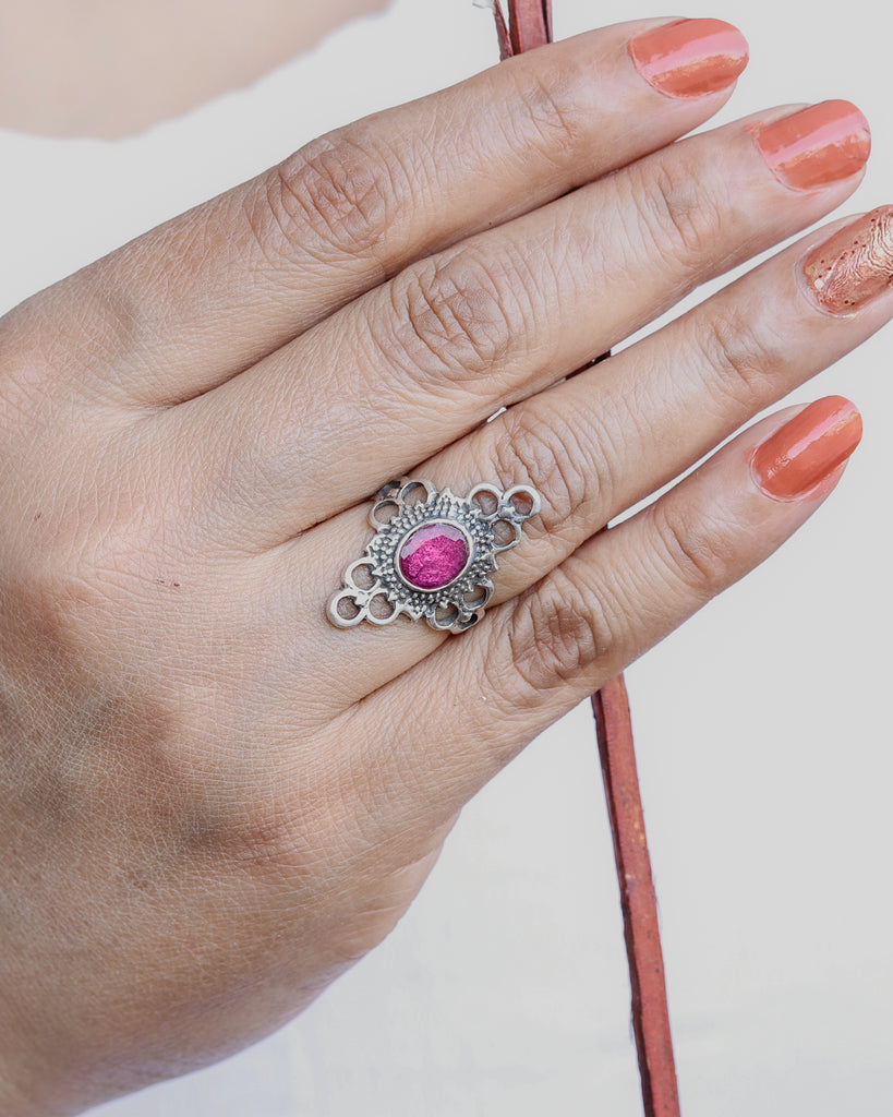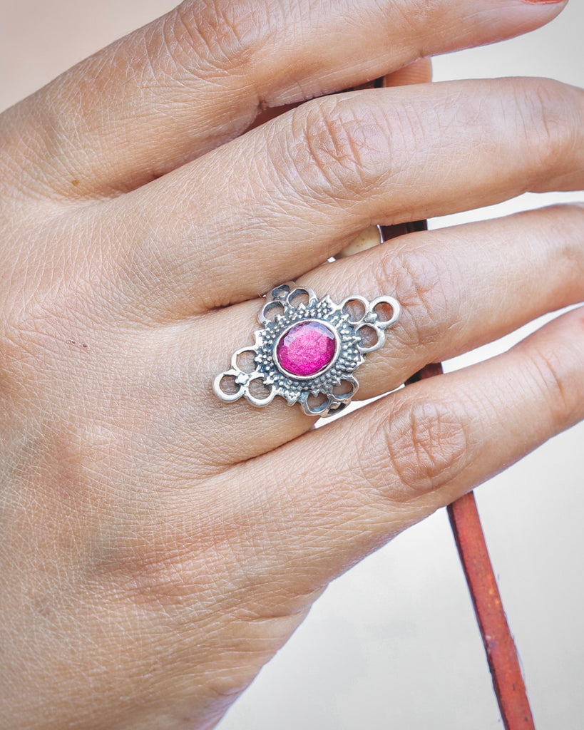 Brighten your look with the Rose Radiance Ring, featuring a vivid pink stone set in handcrafted 925 sterling silver. Its intricate filigree design adds a boho-chic flair, making it the perfect statement piece for everyday wear or special occasions. Pair it with other silver bands for a personalized style or let it shine solo—either way, it’s sure to turn heads.