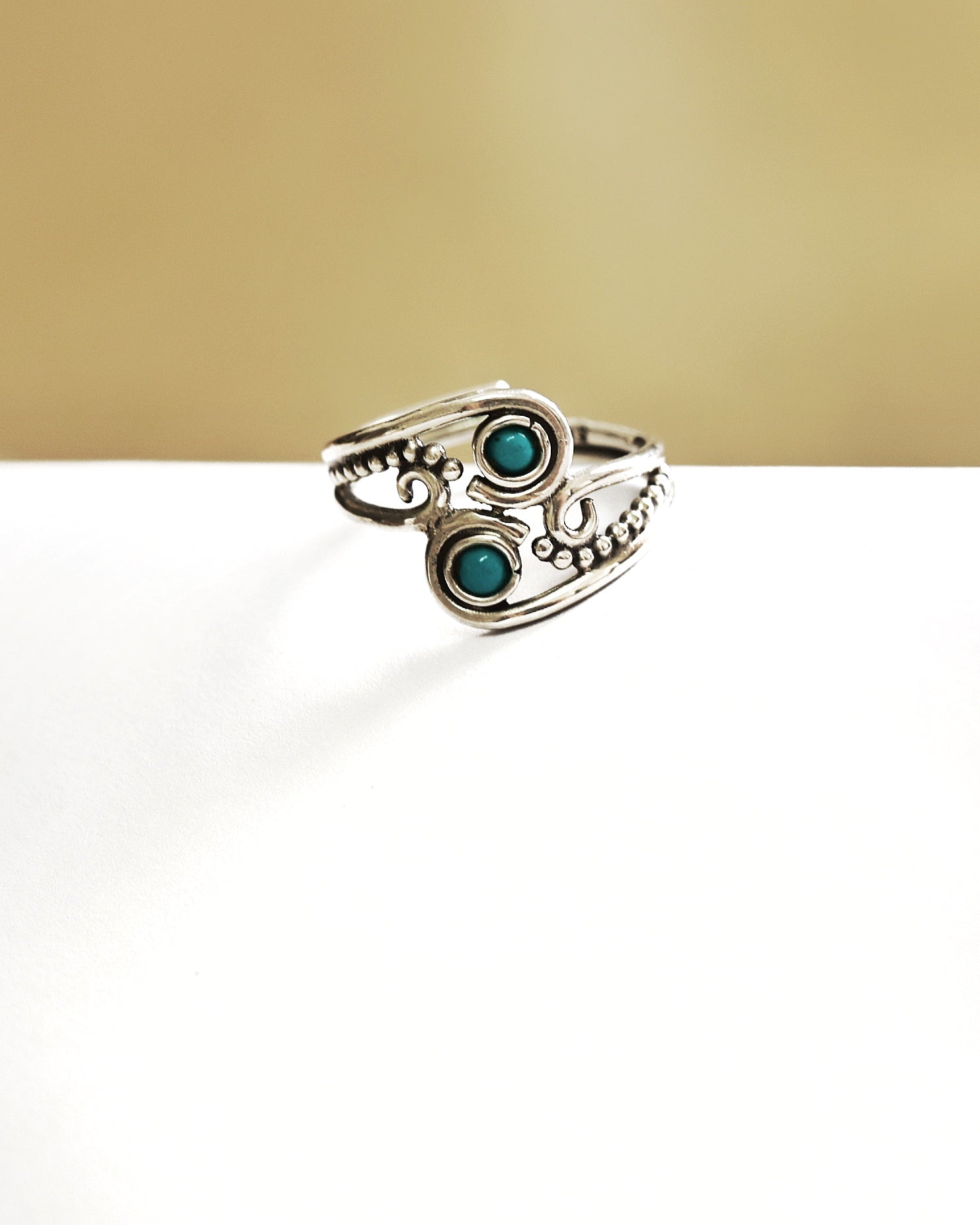 A whisper of tribal heritage meets modern elegance. This handcrafted 92.5 silver ring wraps gracefully around your finger, crowned with twin turquoise stones that bring calm, clarity, and an earthy allure. The curled design and dotted detailing nod to ancient folk motifs, reimagined for today’s free spirits.