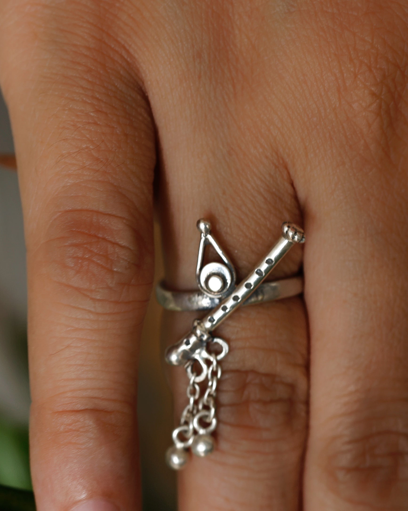 Inspired by the soulful notes of the Indian bansuri, this handcrafted 92.5 silver ring brings melody to your fingers. The flute-like structure, accented with delicate hanging chains, evokes rhythm, grace, and a deep cultural charm. It’s not just jewellery — it’s wearable art.
