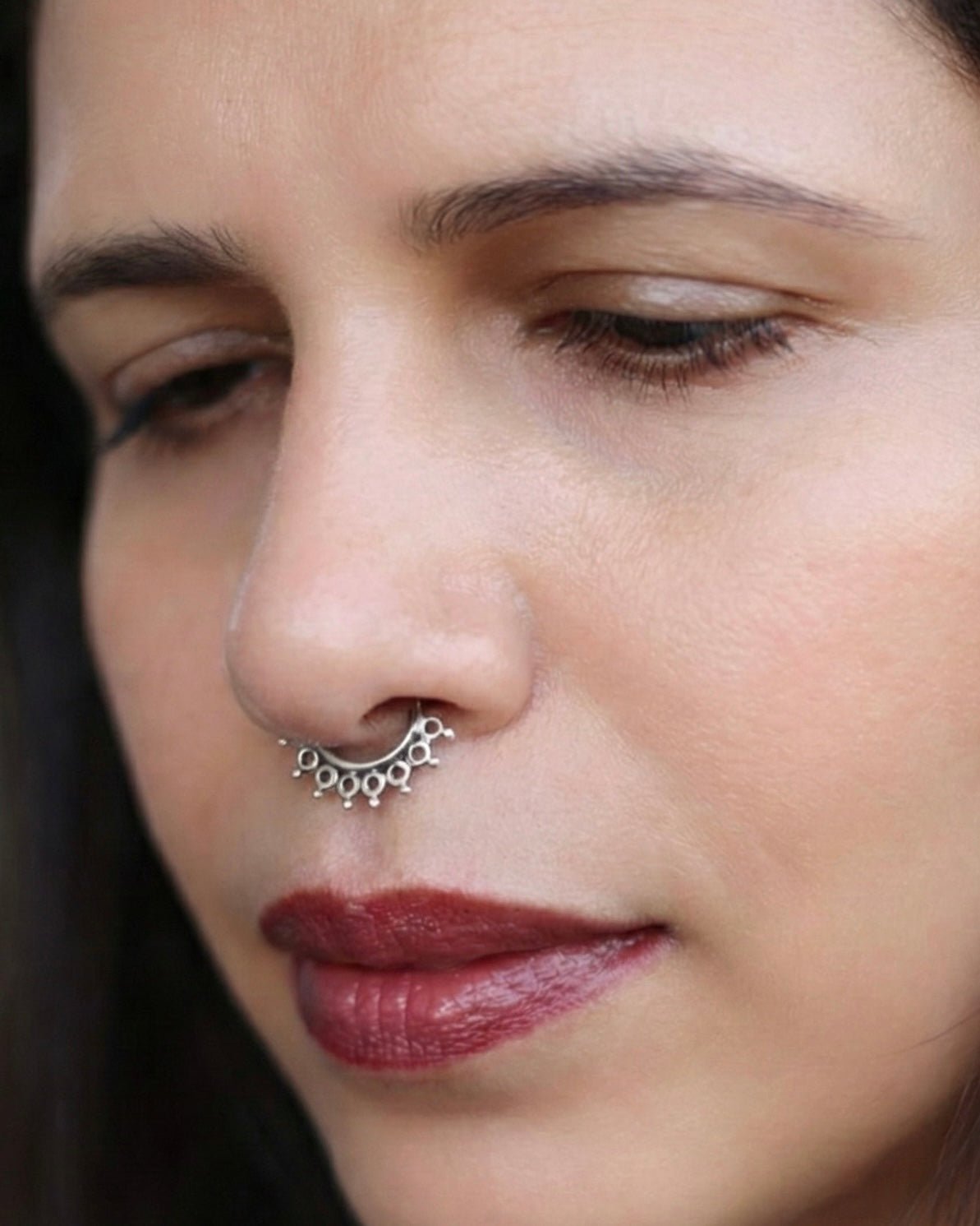 Discover the Chandrika Arc Silver Nose Ring by Smith Jewels a handcrafted 925 sterling silver nose ring with a graceful crescent design and fine detailing. A timeless piece that blends tradition with modern elegance, perfect for everyday wear or festive styling.